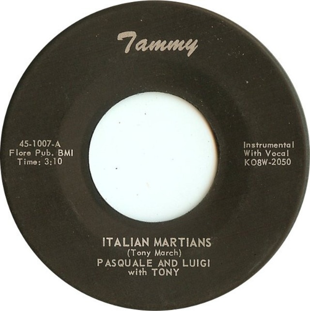 イタリア出身アメリカ育ち、レコード屋やミュージシャンのマネージャーを務めたりしていた男Tony Marchによるムシ声ノベルティソング。カントリーソングをベースにムシ声キャラPasquale And Luigiが茶々を入れます。本作数年前にCBSラジオでやっていた「Life with Luigi」というシチュエーション・コメディに同名のおじさんコンビが出てくるけど、関係あるのかな。B面はおそらくTony本人によるロックンロールナンバー。 Tammy 45-1007 7' US盤 59年 media: VG+ ♪試聴:http://manuera.com/sonota/audio_files/16847.mp3