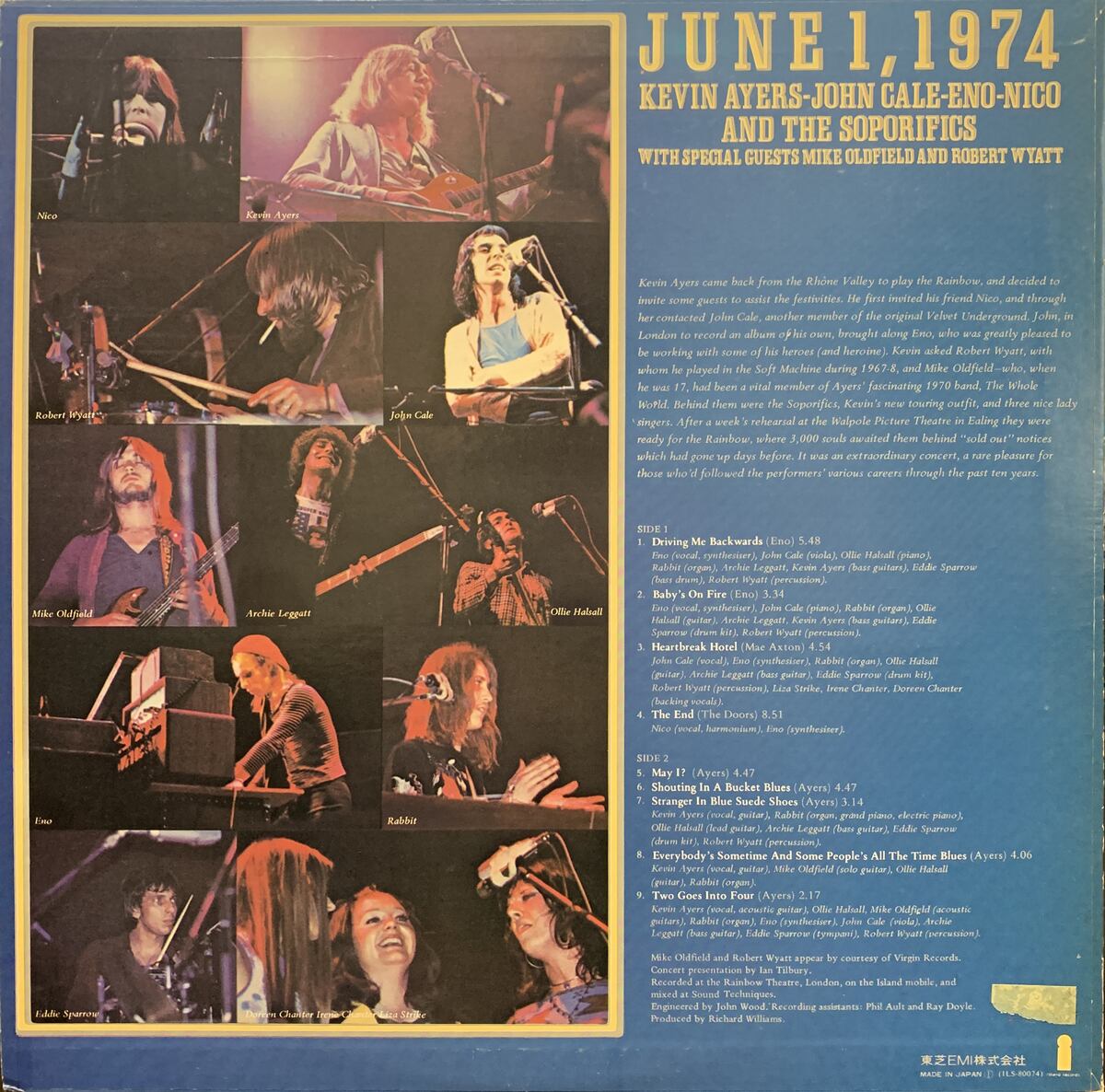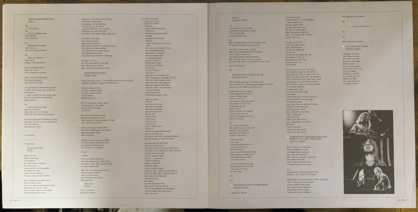 Soft Machine、Velvet Underground、Roxy Musicの奇跡的な合体とも言える歴史的ライブアルバム。ロバート・ワイアット、マイク・オールドフィルド、ニコなどもゲスト参加し、ケヴィン・エアーズ再起記念コンサートにこの豪華なメンツが大集合した。冒頭からイーノの呪文のようなループロック?が続き、唐突なハートブレイクホテル闇解釈カバー、ニコの浮遊するドアーズカバーなどを経て、後半はバラエティに富む楽曲が続きます。事の経緯が日本語で詳しく書かれたライナー付きです。