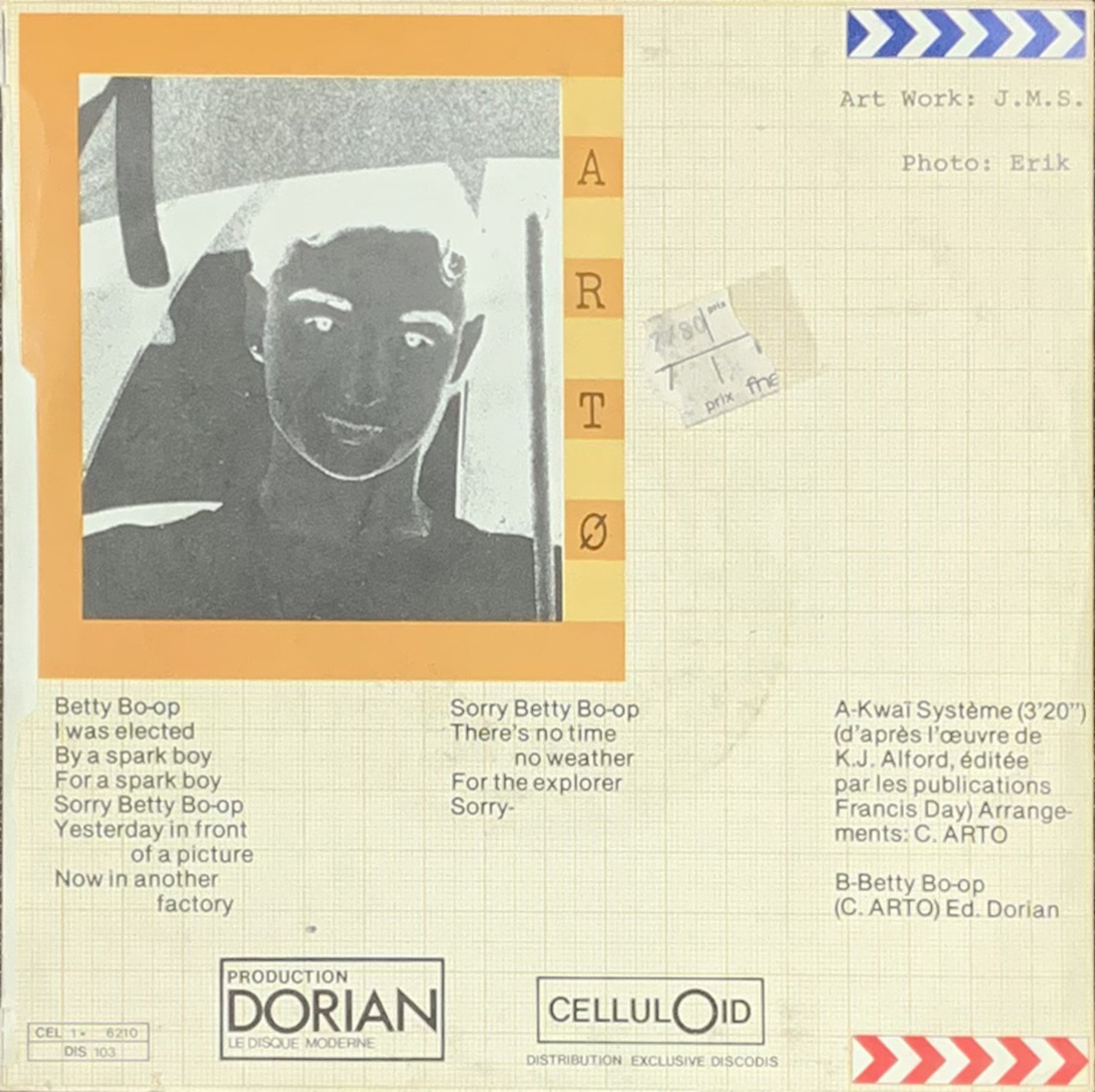 フレンチテクノポップグループ Mathematiques Modernes としても知られる Claude Arto のソロシングル。A面はなぜこれを選んだのか、映画 "戦場にかける橋" の "クワイ河マーチ (aka "ボギー大佐")" のシンセによる疑似口笛メロによるピコピコカバー。この時代にこの横ノリビートのエレクトロは希少ですぞ。B面は Arto のオリジナル。ナイスなチープエレクトロポップ!