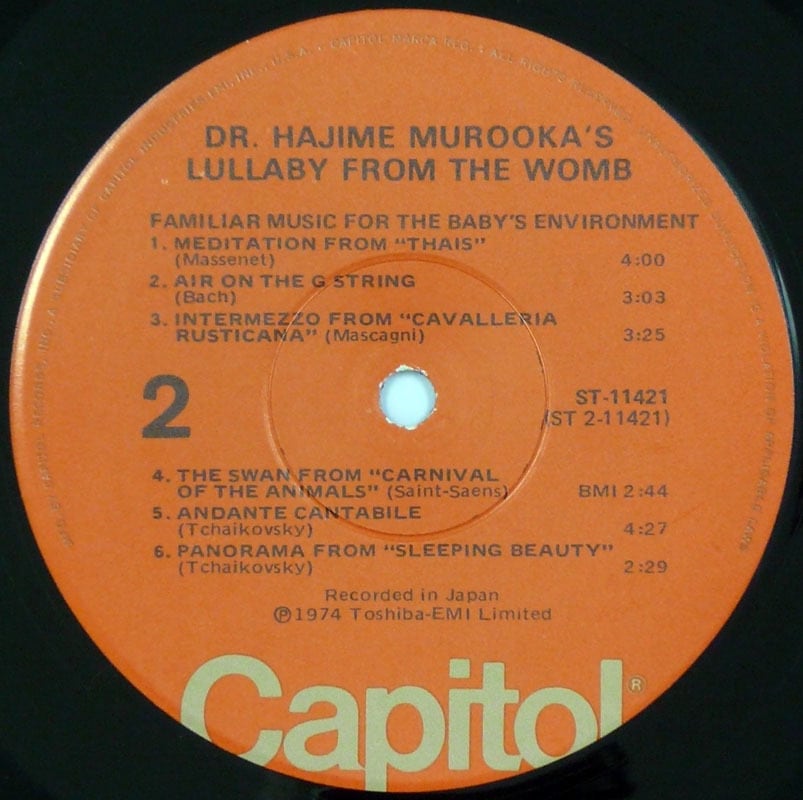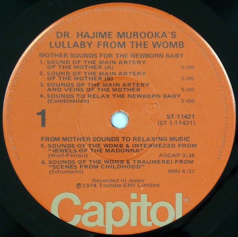 なぜか米Capitolからリリースされた、日本医科大学室岡一教授監修のストレンジなレコード。A面前半は、胎児が母体内で聞く母親の動脈血流音を収録。後半は、胎児がリラックスする低音のドローンと心音とクラシック音楽がミックスされた衝撃的なトラック!本当にこんなもの聴いてまともに育つのかちら。B面は胎教用音楽のみの収録。生まれたばかりの赤ちゃんが泣くのは、それまで聞こえていた音が急に聞こえなくなるからという説もあるそうです。