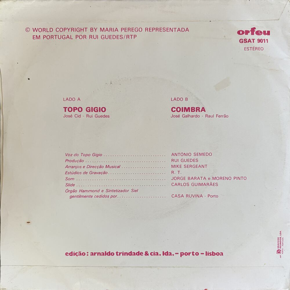 イタリアで生まれたネズミのキャラクター、トッポジージョ。日本でも人形劇が放送されていたので、ご存知の方も多いかもしれません。この盤はポルトガルの作曲家、作詞家が手がけているので、ポルトガル版のオリジナル曲なのかも。よく聴くと声もオリジナルのPeppino Mazzulloによる人力ムシ声ではなく、António Semedoという方の吹き替えですね。どちらにしても両面ともちょっと泣けるいい曲です。