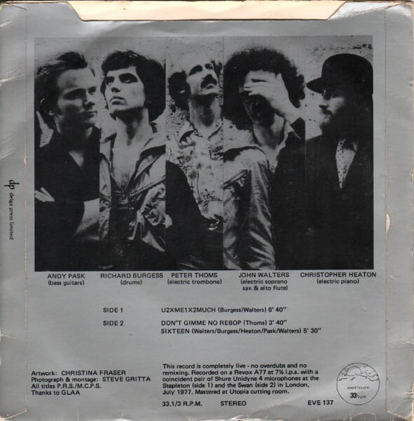 81年の「アインシュタイン・ア・ゴーゴー」のヒットで知られるシンセポップグループと同じバンドとは思えない77年の3曲入りジャズロック33回転7インチ。79年にRCAと契約してエレポップ化したが、個人的にはインディ時代のこっちも全然好きですね。