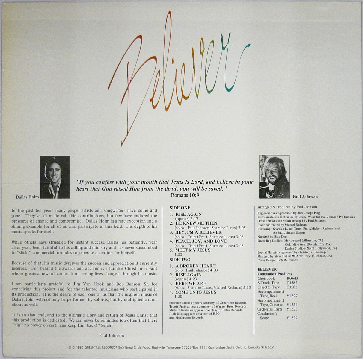 CCM 系 SSW の Dallas Holm のソングライトによるレコードミュージカル。ミュージカルつっても曲の冒頭に軽くナレーションが入るくらいなので、ソングブック アルバムといった趣き。Holm の代表曲の一つ Rise Again 入り。こちらもソングライターとしても定評の Paul Johnson のコーラス隊による演唱。
