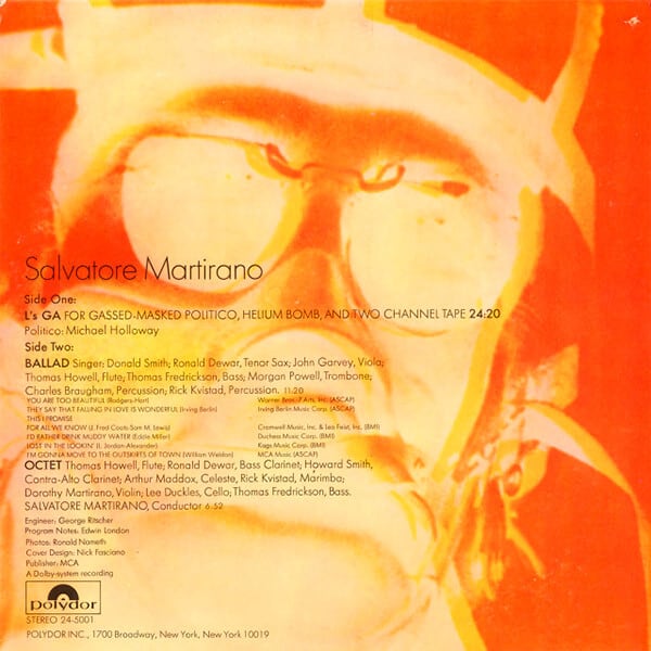 イリノイ大教授マルティラーノの60年代の3作品収録。モンド本でヤン富田さんが紹介していた "L's GA" が狂ってます。ヘリウムガスを吸っての虫声+電子音+コラージュ+S.E.+エフェクト。B面の2作は器楽曲。