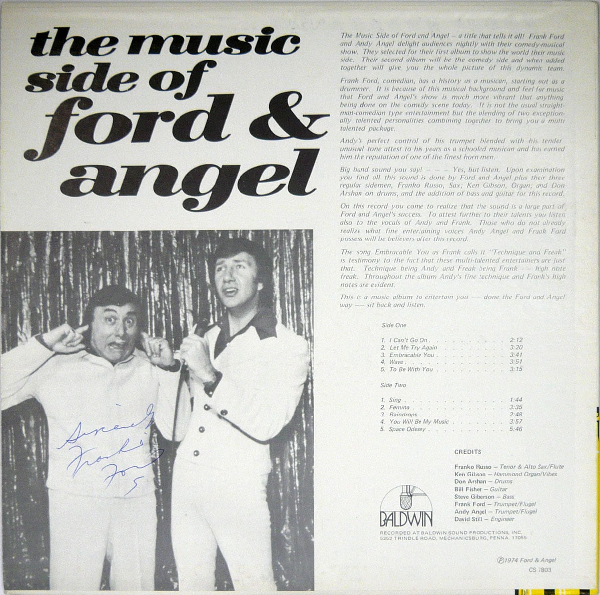 ローカルのパーソナリティと思われるFord & Angel。コメディタッチのステージとセンスのいい演奏力と歌唱で楽しませる地元で人気のエンターテイナーだったんでしょう。彼らは何枚かシングルやアルバムを出していますが、なんといっても人気があるのがこのアルバム。二人ともトランペットかフリューゲルホルンを演奏するので、このジャケットというわけです。なんといってもご機嫌な"SING"が最高ですね。とにかく、バラエティに富んでいて楽しめるアルバムです。