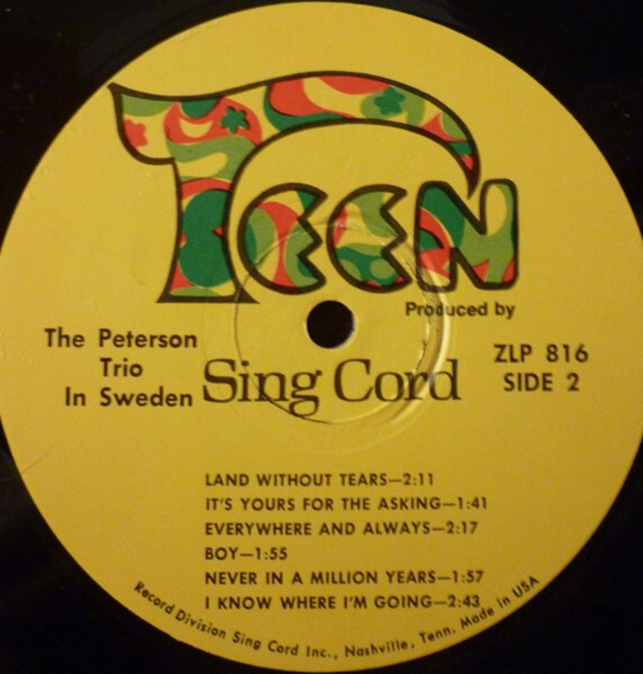 宗教系マイナーレーベルZONDERVANレコード参加のTEENからリリースされたガールズ・コーラス・グループ PETERSON TRIO のスウェーデン録音盤。宗教系にしてはルックスも粒ぞろいの彼女達は、計4枚のアルバムをリリースしているが、この3rdアルバムは1st、2ndに比べると、内容、レア度共に段違い。これは、スゥエーデンでのスタッフBORGE RING AND HIS QUARTER と NILS KJELLSTROMS AND HIS ORCHESTRAに負うところが大きいだろう。ソフトロック感とジャズ感がブレンドされた感じは、CCMと北欧ジャズのミラクルな出会いとも言える。2曲のみBORGR RINGがヴォーカルを撮る曲があるが、これまた渋くていい感じ。ぜひ試聴してください。