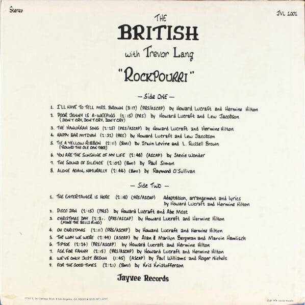 謎多きアルバム。17曲中10曲はBBCで活躍したジャズ作曲家Howard Lucraftのカバーで、そのために作られたアルバムのような気もするのですが、そのほかの7曲の選曲に注目。ロジャニコ「We've Only Just Begun」や「Alone Again, Naturally」「Sound of Silence」「追憶」など、全体的にとてもソフトなボーカルが魅力的です。なぜか途中まで歌ってあとはインストになります。演奏は全体的にとてもグルーヴィーなのになぜかバンジョーが入ってくるのが特徴的で新鮮です。