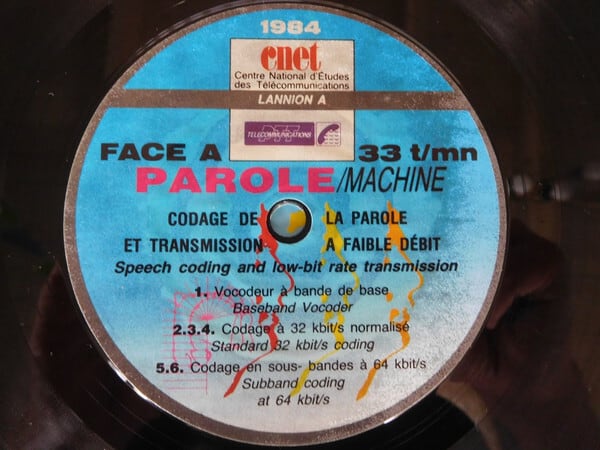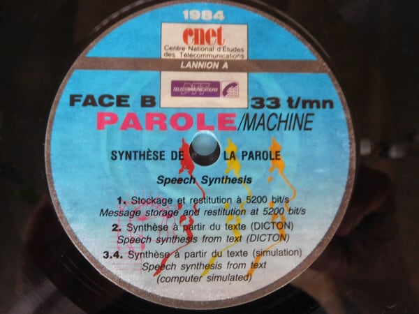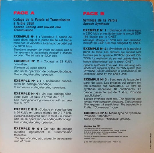 フランスの国立電気通信研究センターが制作した、声に関する実験レコード。A面は音声符号化と低ビットレート伝送。あるボーカルサンプルを8回連続エンコードデコードしたものやなど。B面は音声合成でCNETが開発したソフトウェアによって作られたフランス語のジャキジャキした音声が収録されています。