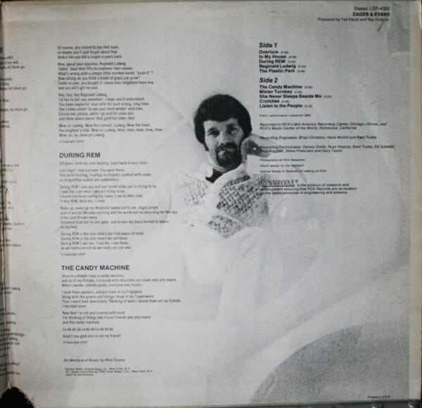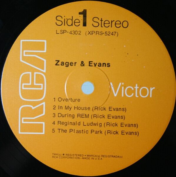 シールド!"In the year 2525"のヒットで知られる Denny Zager と Rick Evans のデュオグループの 2nd。モーグ使用など凝ったアレンジで聴かせるソフトサイケ好盤。独特の浮遊感を漂わすA5"The plastic park", B1"The candy machine"、ソフトなフォークロック感のB2"Mister turky"等。まずは本当に夢を見ているような、もしくはラリってるような、エフェクティヴなコラージュナンバーA1 "Overture"を聴いてぶっ飛べ!。