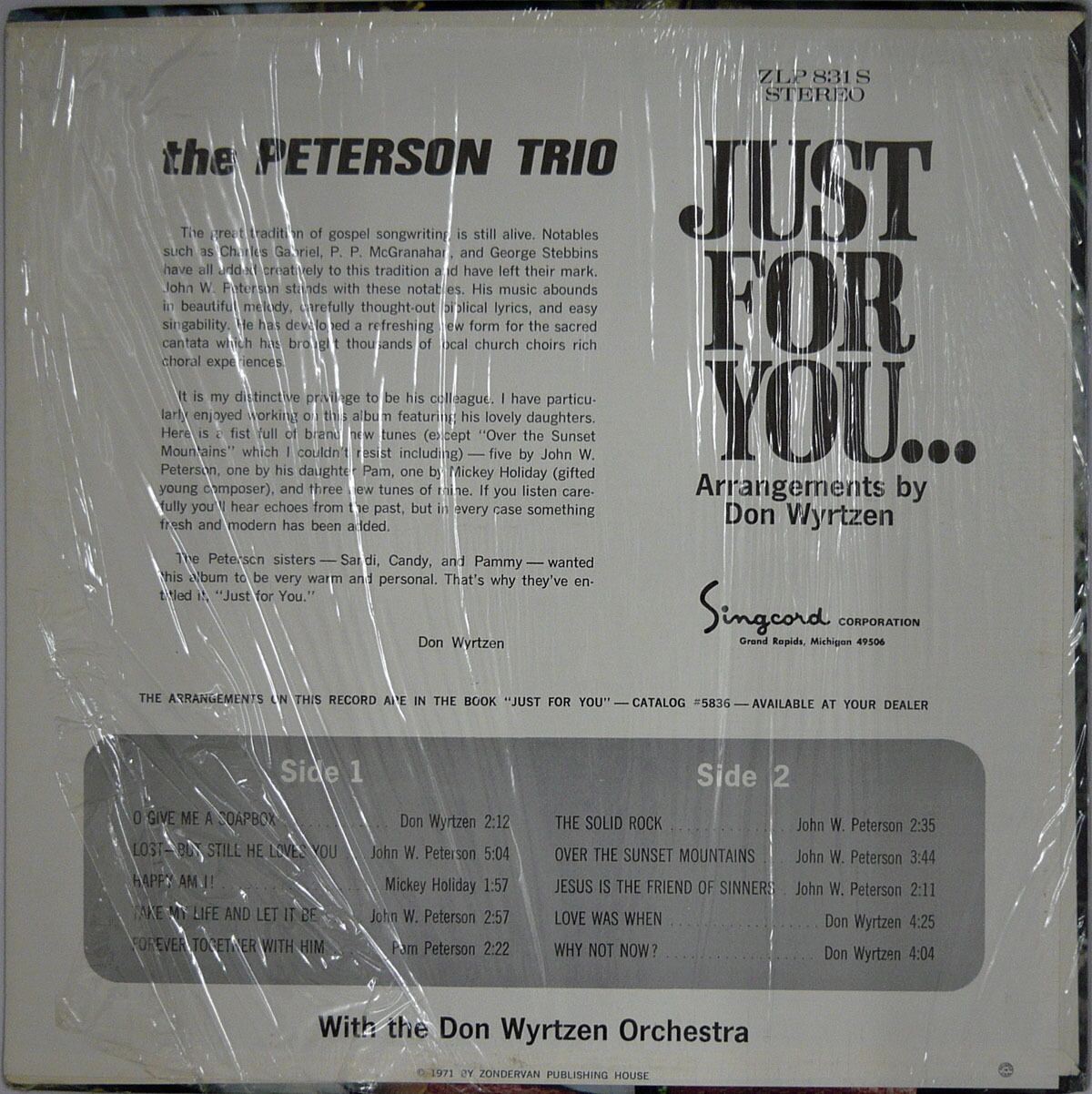 宗教系マイナーレーベルZONDERVANレコード傘下のNOW SOUNDからリリースされたガールズ・コーラス・グループ PETERSON TRIOの1971年発表の4枚目のアルバムにして最高傑作。CCMにしてはルックスも粒ぞろいの彼女達は、計4枚のアルバムをリリースしているが、特にこの4枚目と前作はほとんど見かけないレア盤。このアルバムはバックの演奏をDon Wyrtzen Orchestraが担当し、Wyrtzenも3曲を書き下ろしている。他に彼女達の父親Johnも曲を提供している。