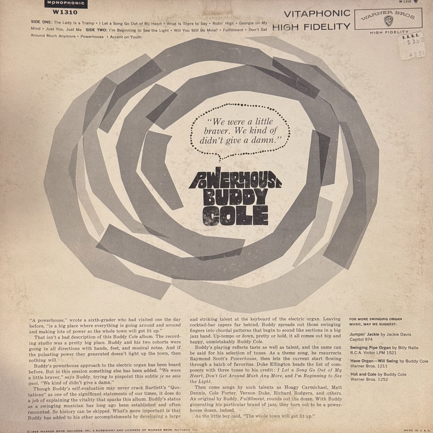 34年に劇場オルガニストとしてデビューして以来、Alvino Rey楽団に参加したり、ナット・キング・コールの初期のボーカルヒット"Nature Boy"やビング・クロスビーとのレコーディング、ツアー、ラジオやテレビへの出演と40〜50年代に活躍した名オルガニストBuddy Coleが59年に発表したハモンドオルガンでスタンダードジャズをラウンジーにカバーしたレコード。なんてったってRaymond Scottの"Powerhouse"をタイトルにしちゃってるんだから、悪いわけナ〜イ! 他に軽快な "Lady is a tramp" や、"Don't get around much anymore" などよい雰囲気。ジャケットの写真も普通に美女ジャケかと思いきや、背景の建物は発電所! ! ビビビッ! 後にキング・シスターズの一人(Yvonne)と結婚、Alvino Reyと親戚になっちゃいました!(Reyは同じくキング・シスターズのLouiseと結婚してるのよ)