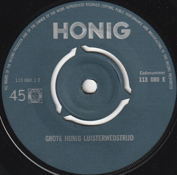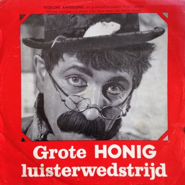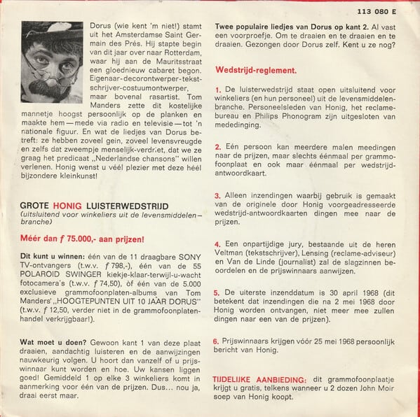 ジョンモアスープを2箱買うともらえるショップオーナーからのプレゼントレコード。A面はオランダの人気コメディアンDorusの効果音入りのコメディ楽曲が2曲(これがなかなかいい曲!)、B面はゲームになっていて、スリーブの裏面にルールが書かれているというマルチメディア戦略になっております。