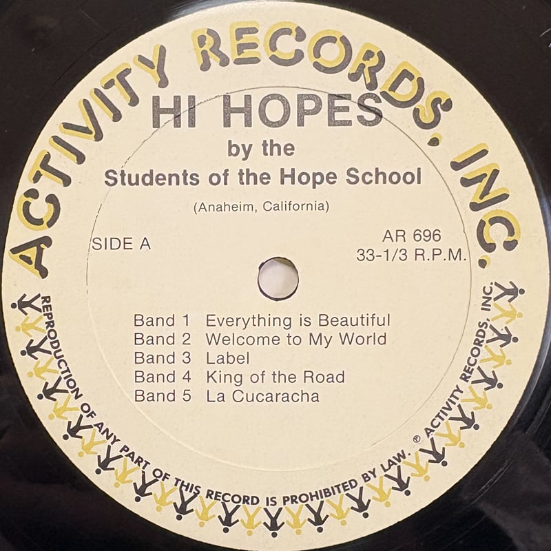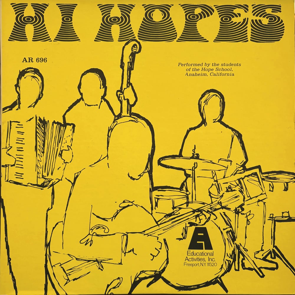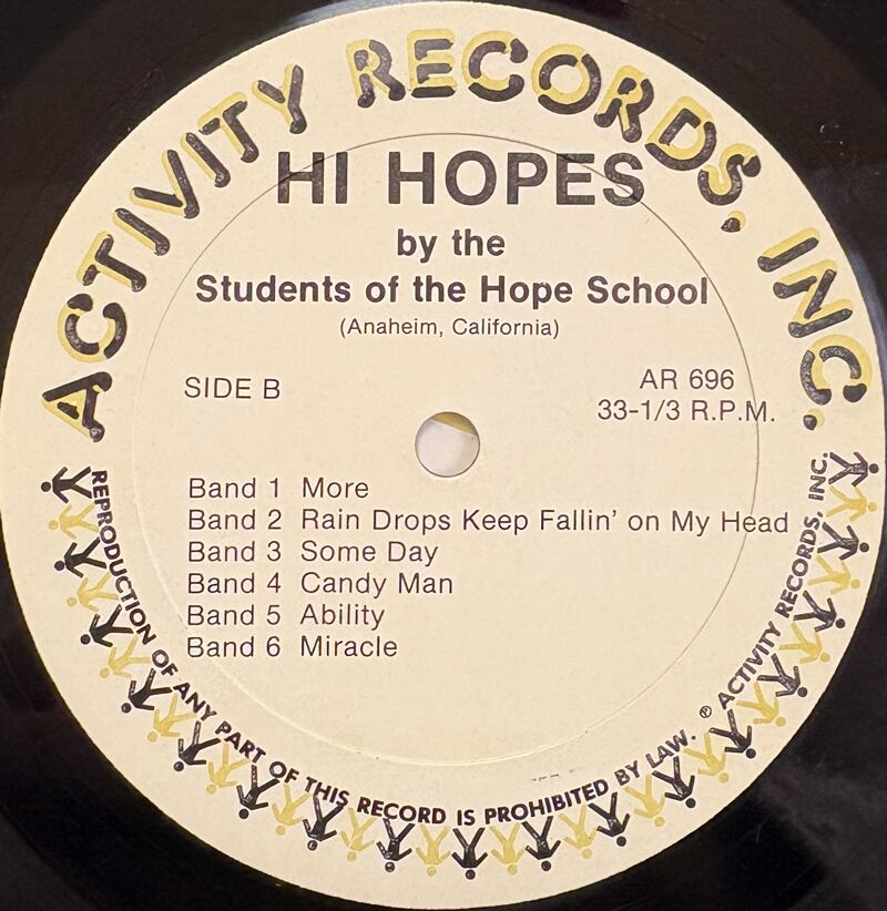 アナハイムの障害者専用学校「ホープ高校」の生徒によって結成されたHi Hopesは、ろうあ、ダウン症、知恵遅れなどの様々な障害を乗り越え、現在まで十枚以上のアルバムを出し続けている。73年に発表された初期作品である本作は、まだ演奏やアレンジが荒削りで、それがプリミティブな魅力となっている。先生のDorisさんによるオリジナル曲4曲のほか、Bacharachの「雨にぬれても」や「Candy Man」などを独特の解釈で演奏。