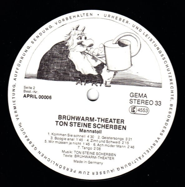 ドイツのゲイシーンで政治的な活動を行なっていたBrühwarmの音楽を担当していたのがリオ・ライザー率いるクラウトロックバンドTon Steine Scherben。音楽的にはまさに混沌とした内容。グラムロック、ジャズ、ワウギターがスパイシーに鳴り続けるジャンル分け不能の猥雑ポップロックだが、やはり演劇集団だけあって、酔っ払いのようなボーカルの表現力がすべてを包摂しております。