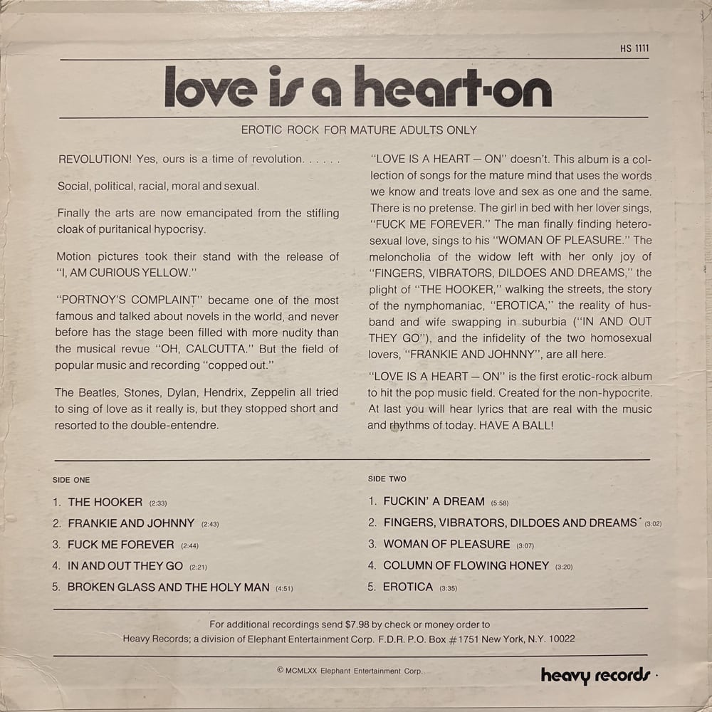 とりあえず裏ジャケの曲名を見てください。アーティスト不明のエロティック・ロックアルバム。その正体は1969年に"32,000 Pound"というプログレッシブなヘヴィサイケアルバムをリリースしていたHEAVY BALLOONによる変名プロジェクト。直接的にエロい歌詞によるロック、エロック!謎の女性にVO.によるスウィートな曲(歌詞いとひどし!)もあります。