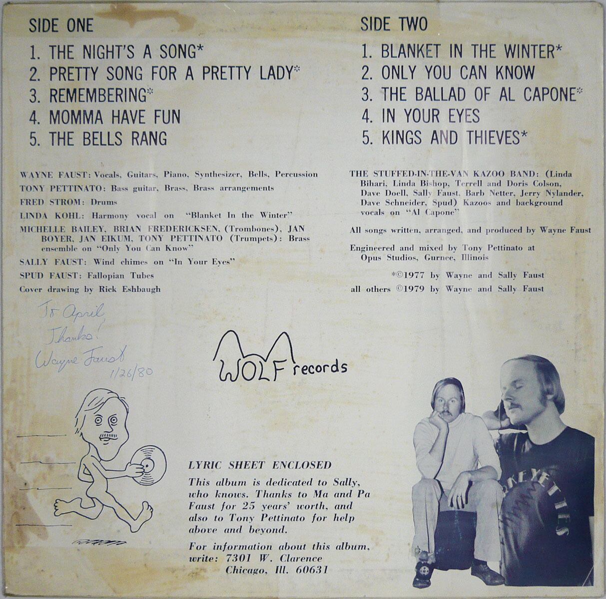 現在はスキーシーズンのコロラドに、夏のキーウェストと、各地を回るコミックシンガーとなった Faust の秘密?の初期自主制作盤。この後 Dr. Demento Show にも取り上げられる Faust & Lewis デュオでコミックスタイルを確立しますが、本作は全曲オリジナルのSSWアルバム。人を明るくさせるようなウォームな作風がエンターテイナーとしての活躍を予感させますね。イリノイ録音。