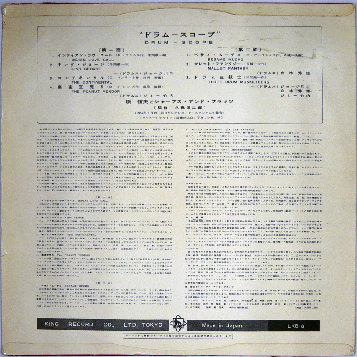 57年8月録音。ジョージ川口、ジミー竹内、白木秀雄の三名のトップジャズドラマーをフィーチャーした企画作。各人2曲と三名の共演を1曲収録。すべて原信夫とシャープスアンドフラッツとの演奏です。監修:久保田二郎 / ジャケデザイン:近藤鉄之助 / 写真:小林靖