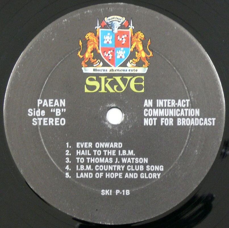 NYのコンピューター関連コンサルタントサービス会社であったACTと、その子会社のInter-ACTが、IBM社への異常なまでの賛美やへつらいをトラディッショナルな歌にし、あのCal TjaderでおなじみSKYEレーベルからリリースしているという、本当にストレンジで謎多きアルバム。曲名や歌詞に「IBM」とか、当時のIBM社長や取締役の実名がいっぱい出て来て、ジョークなのか本気なのか、はたまた業界の巨人に対する皮肉なのか全くわかりません。ただ "Hail to the IBM" なんて曲名を見ると、やっぱり皮肉なのかな。それにしてもなぜSKYEから?ほんとわからん。