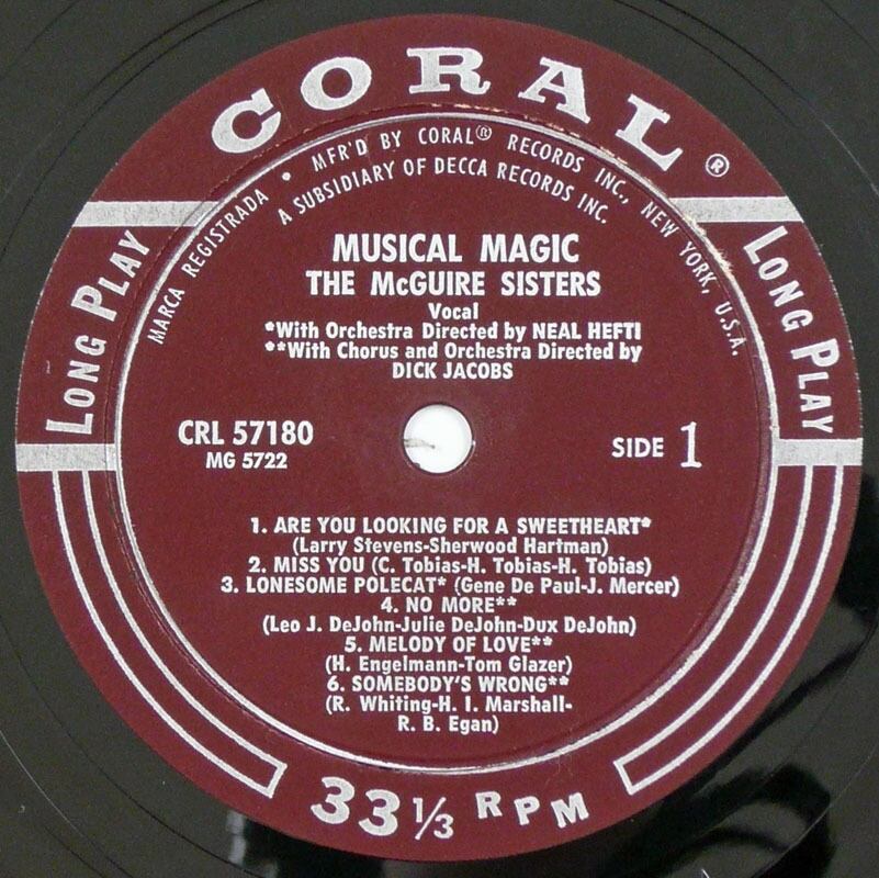 マクガイアシスターズは、メインストリームのトレンドがスイングダンスクレイズからエモいボーカルポップスに更新された50年代に人気を博した一組。コーラルレーベル時代前半の53〜57年のシングル曲を中心にした編集盤と思われます。No More、Lonesome Polecat、Miss You、etc。