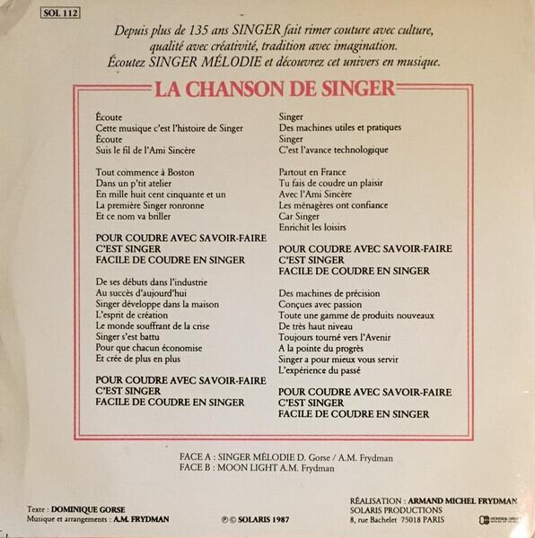 仏盤 87年。アメリカのミシンメーカー老舗シンガー社のフランスでのノベルティー7inch。A面は男女歌唱のミシン讃歌、B面はなぜか?あんにゅいなインスト曲。作曲&制作は Armand Michel Frydman。Frydman は Saga de Ragnar Lodbrock に参加したり、フレンチプログレ人脈周辺の鍵盤奏者。直球すぎるけどヘンなジャケ。