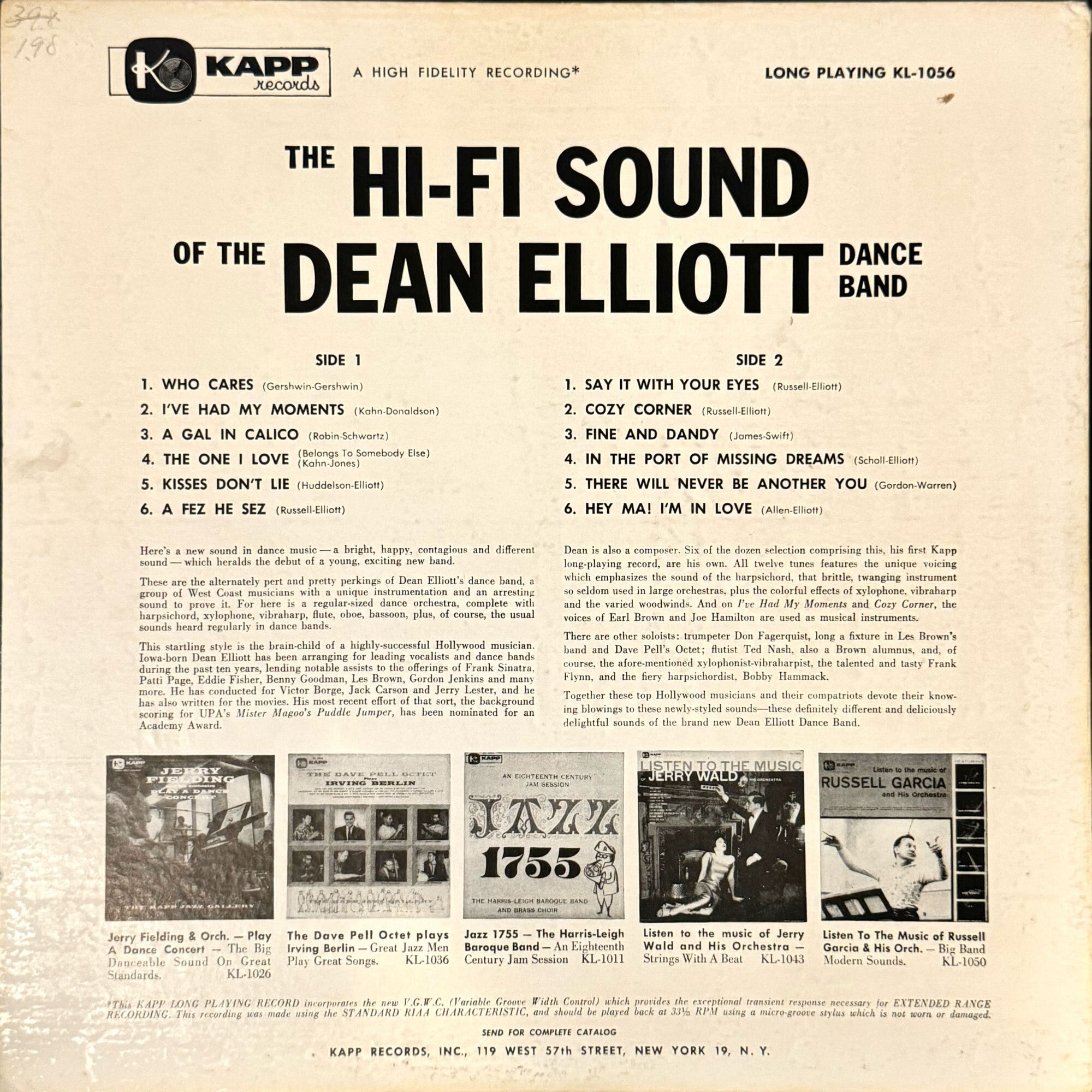 西海岸でビッグバンドのアレンジや劇伴作曲を営むディーンエリオットは、ほとんど裏方に徹していたようでいまだにその全貌は知れませんが、1960年前後にわずかに残したリーダー作の一つ、スペースエイジラウンジ有数の名作「Zounds! What Sounds!」で有名です。本作もそんなスペースエイジなラウンジジャズの好作で、ハープシコードのクラシカルで新奇なサウンドをユーモアあるジャズバンド演奏にアレンジにした愉快なアルバムです。半分オリジナルですが、The Axidentals など歌手に提供していた歌ものをインストにアレンジしたようです。fe. Bobby Hammack (key)、Frank Flynn (per)、Ted Nash (flt)、etc。
